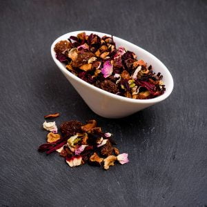 Pasas (pasas sultanas (99,5%), aceite de girasol (0.5%)), hibisco, escaramujo, manzana, arándano (arándanos (60%), azúcar de caña, aceite de girasol), pétalos de rosa, aroma natural. Puede contener trazas de GLUTEN, HUEVO, CACAHUETES, SOJA, LECHE, FRUTOS DE CÁSCARA, SÉSAMO Y SULFITOS