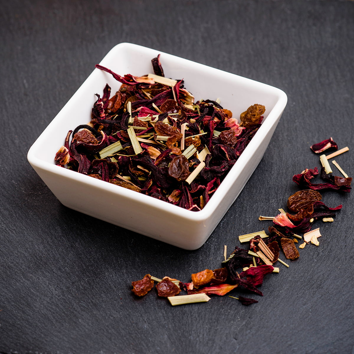 Hibisco, escaramujo, pasas (pasas sultanas (99,5%), aceite de girasol (0.5%)), cáscara de limón (10%), jengibre (10%), lemongras, aroma natural. Puede contener trazas de GLUTEN, HUEVO, CACAHUETES, SOJA, LECHE, FRUTOS DE CÁSCARA, SÉSAMO Y SULFITOS