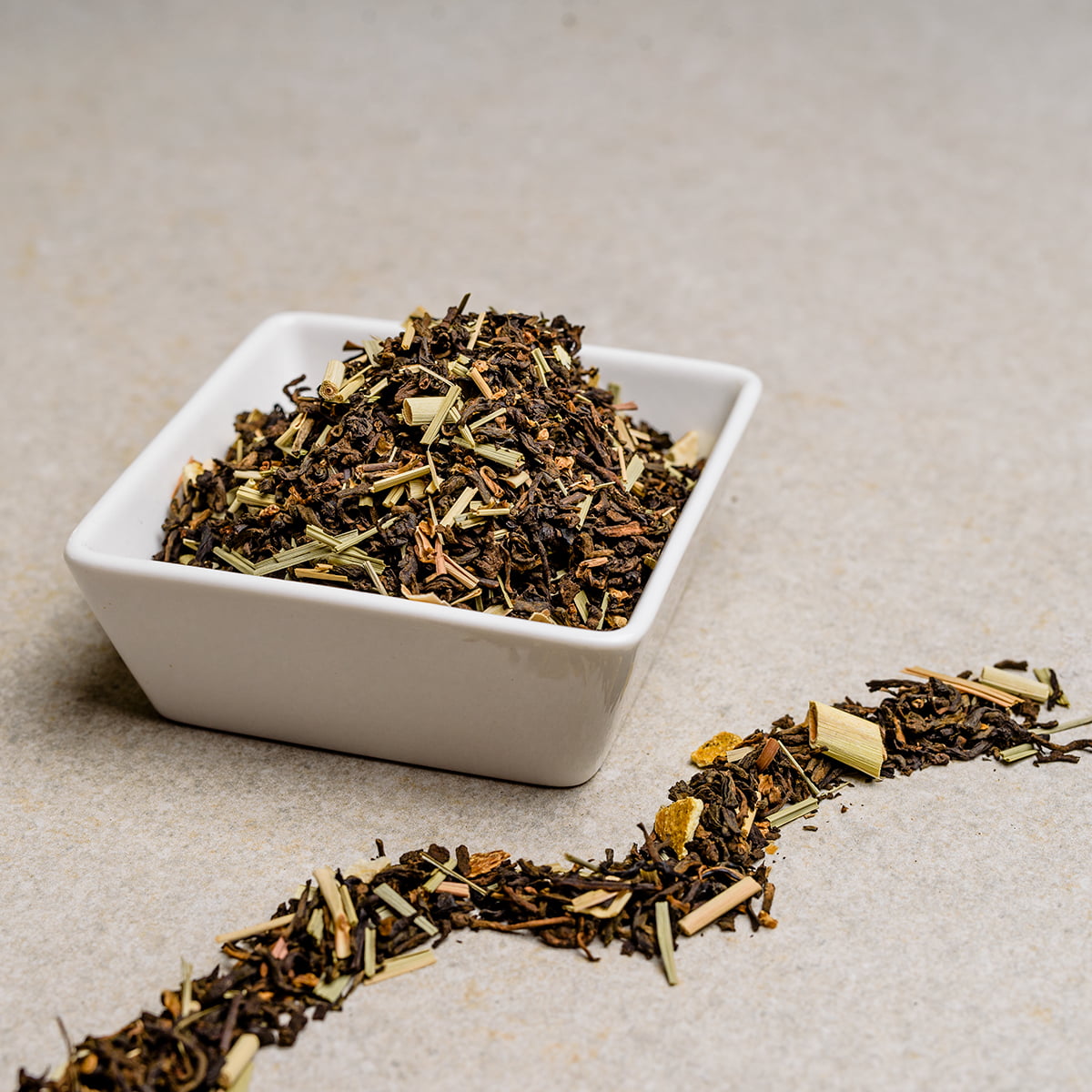 Té rojo Pu erh (81%), cáscara de naranja (6%), cáscara de limón (6%), lemongras, aroma natural. Puede contener trazas de GLUTEN, HUEVO, CACAHUETES, SOJA, LECHE, FRUTOS DE CÁSCARA, SÉSAMO Y SULFITOS